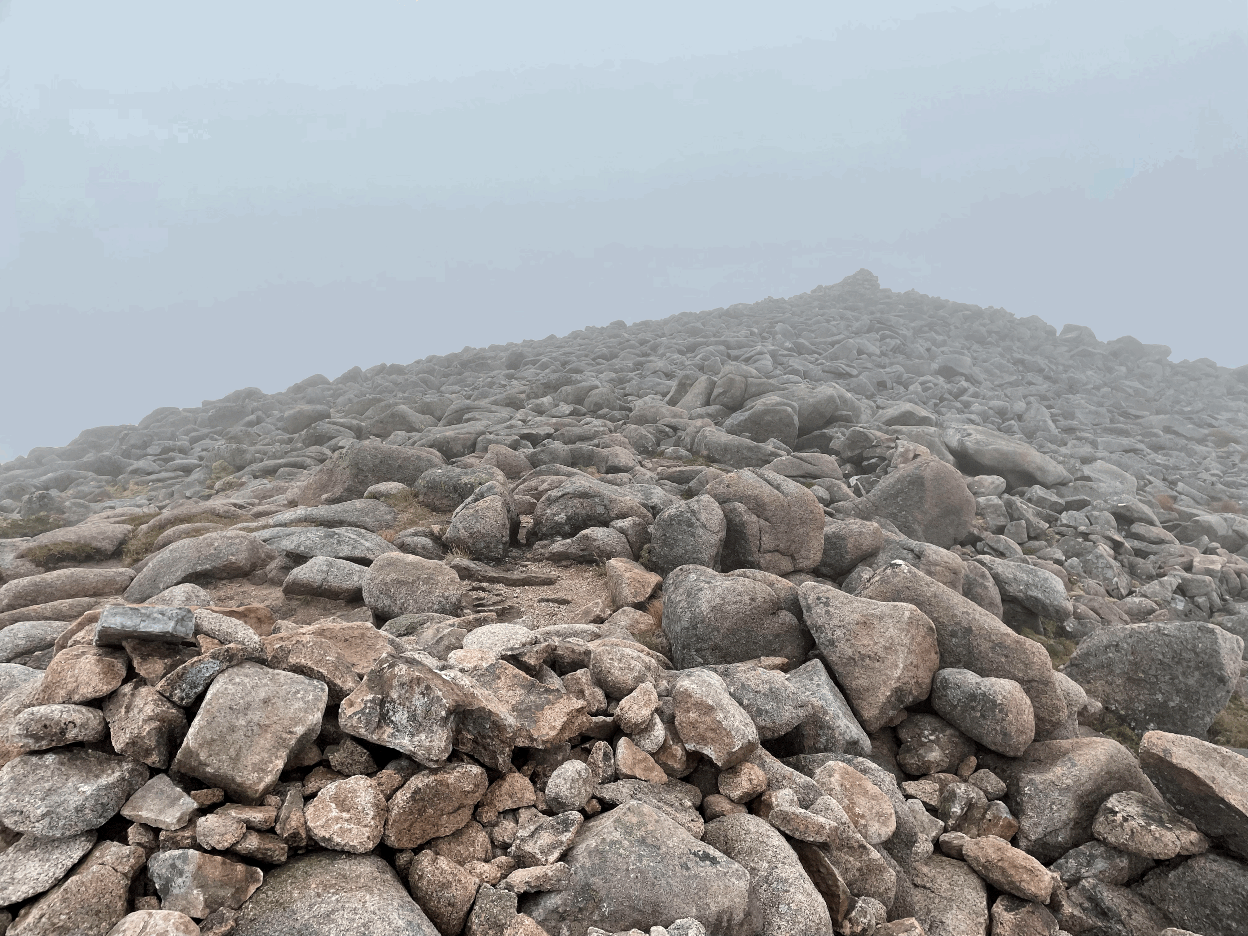 It’s not actually the top of the mountain. The ridge is a false summit and, Scottish mountains being Scottish mountains, the actual top is shrouded in fog and anticlimax.